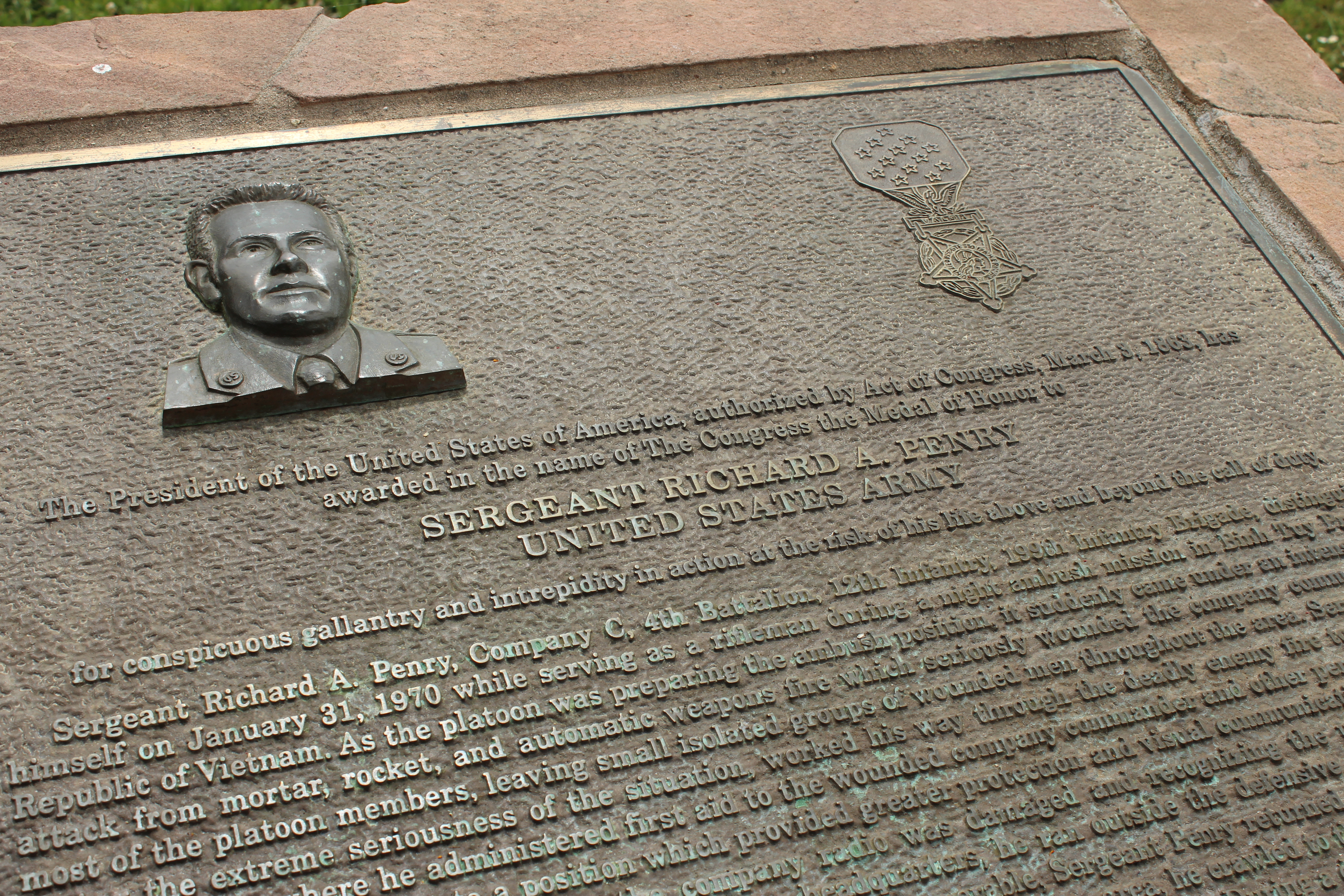 A monument at Penry Park, dedicated to Sergeant Richard A. Penry, a Congressional Medal of Honor recipient.