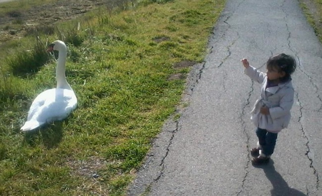 This aggressive swan at Shollenberger Park was hissing at dog walkers, but didn’t seem to mind a little gawking toddler.