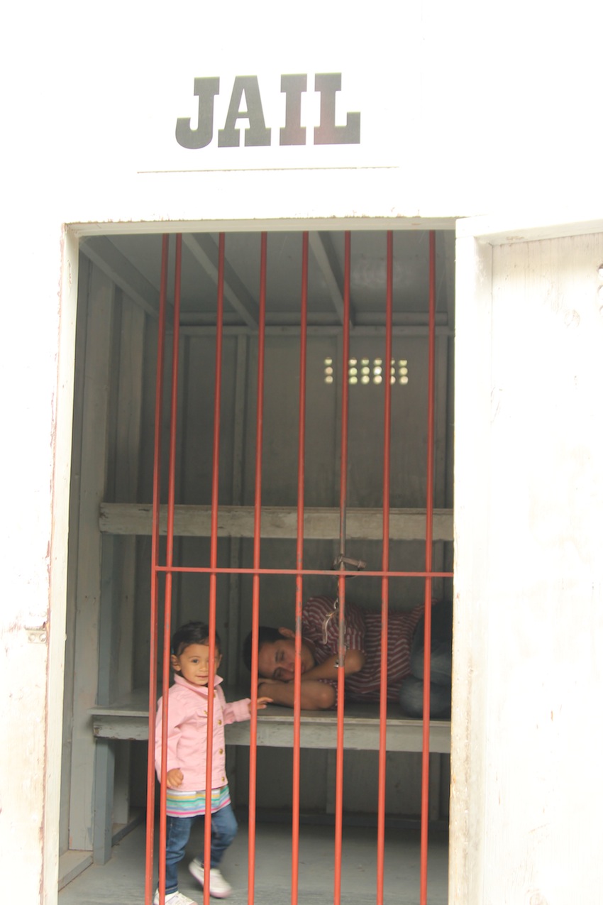 Our stop along the way was at the petting zoo and a miniature 19th-century town center. For a quarter, you can buy a handful of pellets to feed the alpacas and goats, and believe me, these guys were only interested in the food. As soon as they would finish our pellets, they’d move on to the next outstretched hand. I tried to reach out to an alpaca to rub its neck, but missed as it swiftly dodged my hand. Oh well. We visited the mini jail, church, and school in the town center, with Bethypoo waving and smiling at the other happy toddlers, and then boarded the train to finish our journey.