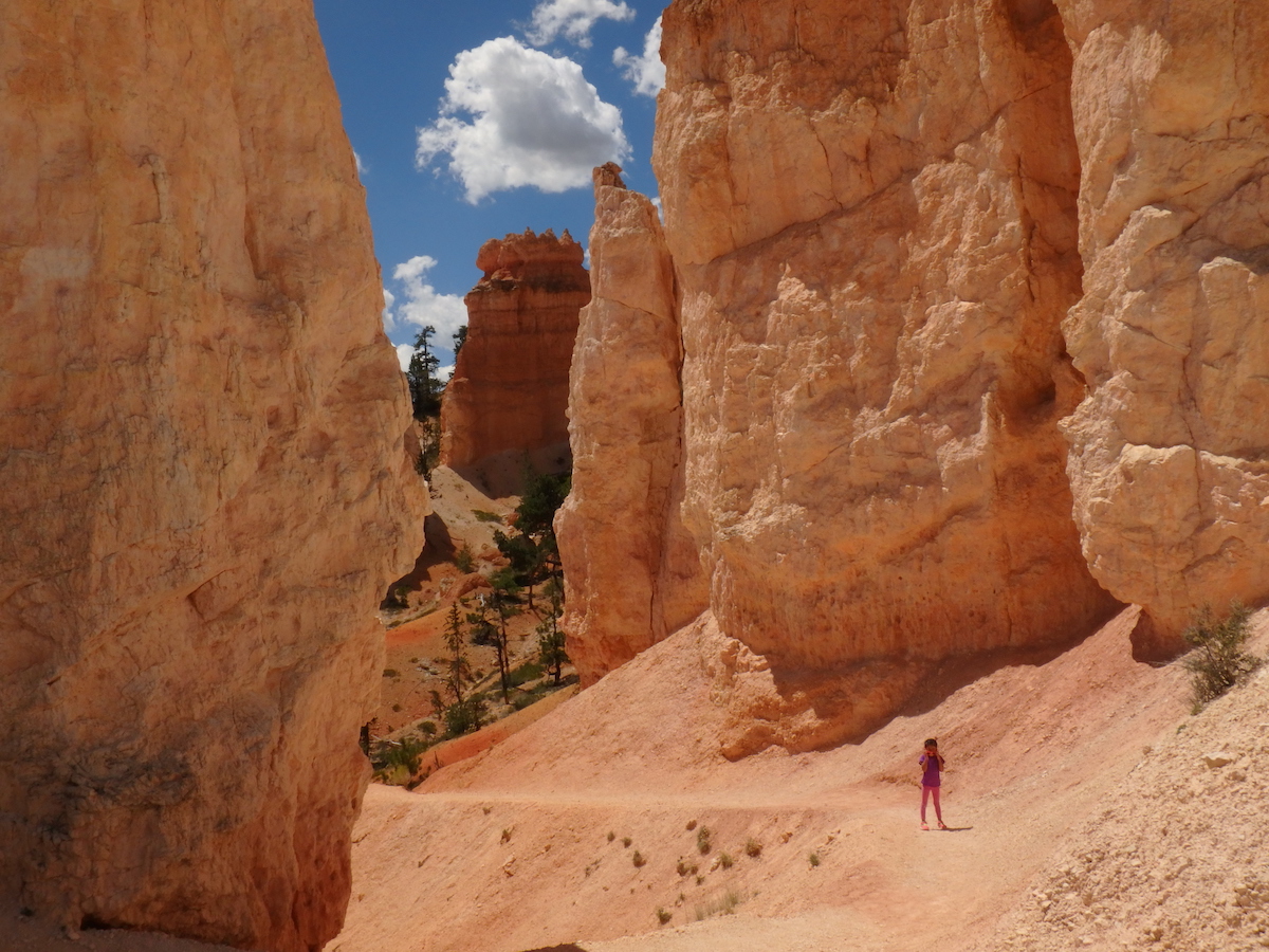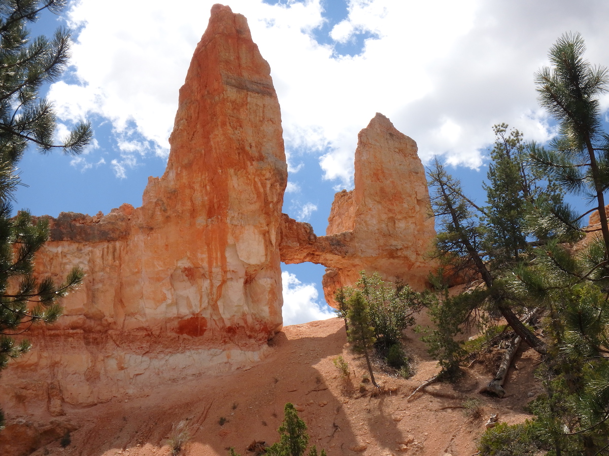 As soon we reached the rim of Bryce Amphitheater and viewed what was before us, we were both silent for a moment. We could not think of any words to describe the vast beauty! The pink and red colors of the hoodoos, canyons, and sedimentary layers against a deep blue sky with clouds Bethany described as “floating cotton balls” was an amazing sight to behold. We opted for the trail leading to Tower Bridge; this rock formation supposedly resembled that famous bridge in London.