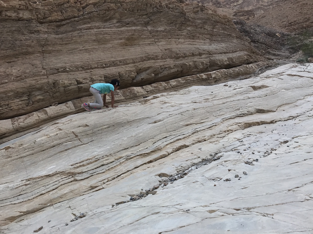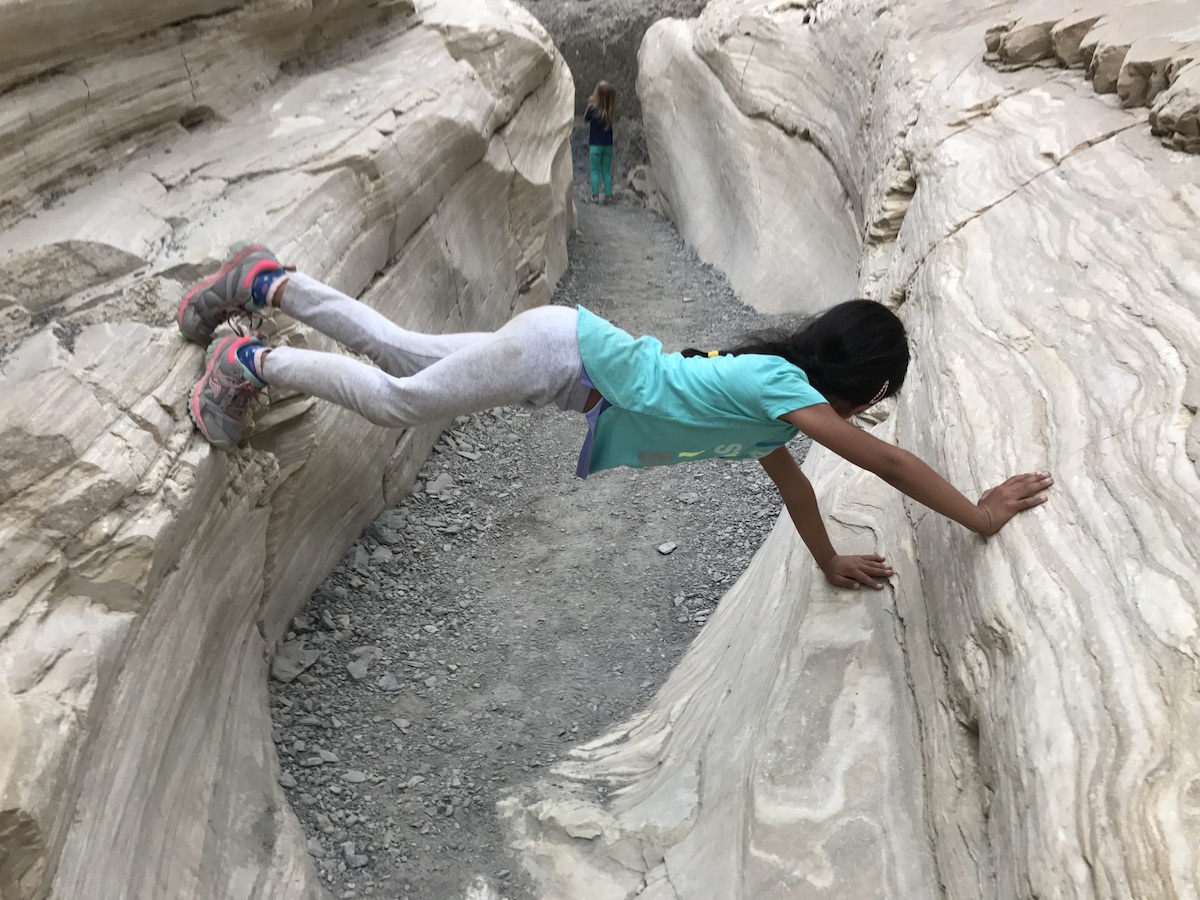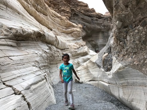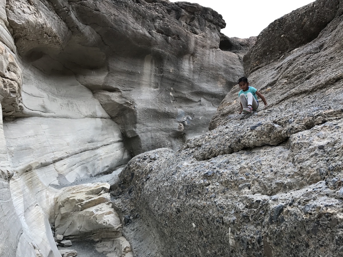 Our last stop at Death Valley was Bethany’s favorite: Mosaic Canyon. Despite another bumpy dirt road drive to the trailhead, it was worth the visit! A few minutes into the trail, we entered a narrow slot canyon with walls of smooth marble and rough breccia, and Bethany enjoyed her exploration around the rocks. She was careful not to slip on some of the smoother marble surfaces, and I held my breath a few times during some of her short but daring climbs!