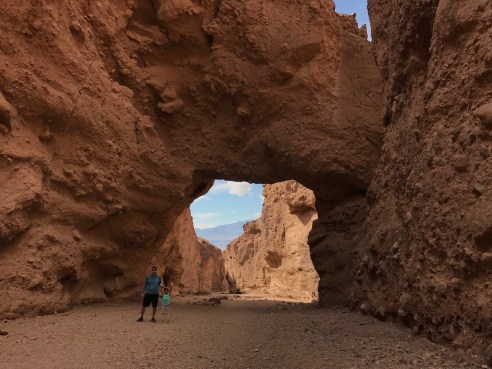 Next up was the Natural Bridge Trail. We bounced around on the slow 10-minute dirt road drive leading to the trailhead, and hiked to the “natural bridge”. This wide, canyon-enclosed trail has a steady incline leading to the arch, and Bethany handled it well. We spent a few minutes admiring and discussing basic geologic features created through the processes of erosion, and on the hike back to the trailhead enjoyed a view of the salt flat basin in the distance.