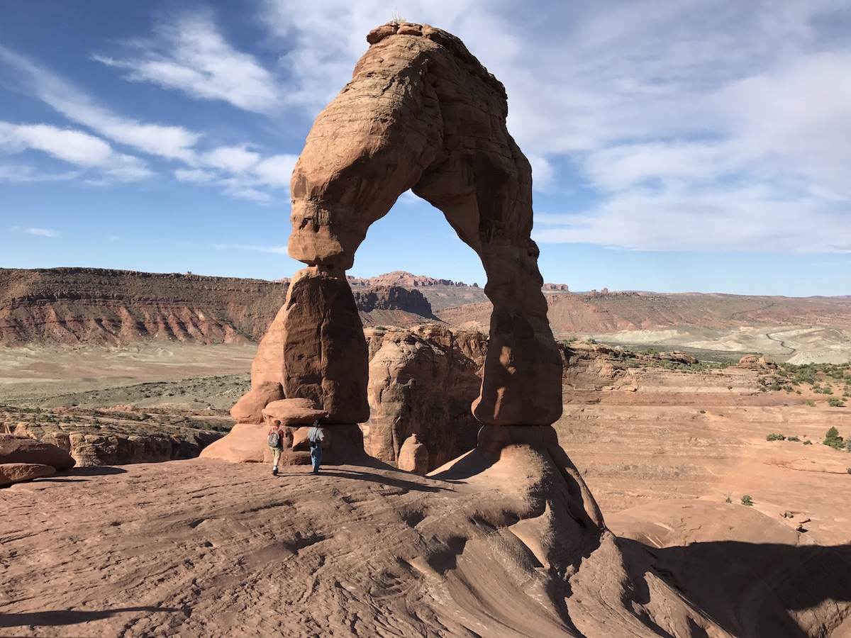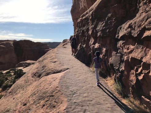 We arrived at the trailhead about 7:15 AM, and after a half mile or so, the first ascent on slick rock was upon us. Aided by a relatively cool temperature of around 70°F/22°C, Bethany handled this steep section of trail with ease. The next half mile of the trail was an easy ascent to a ledge, which at times was somewhat narrow and maybe a little worrisome at first (for me, anyway) because of its location next to what would be a long fall to the bottom of a canyon, but none of this fazed Bethany as we hiked around a wall of rock to eventually witness the beauty before us! Delicate Arch’s opening is 46 feet high and 32 feet wide, making it the largest free-standing arch in the park, and we sat for a few minutes to simply gaze at this breathtaking natural structure. We later crept down to the arch itself, lied on our backs underneath it, and treated ourselves to a dizzying perspective of the arch above us (and perhaps photo-bombing hundreds of pictures in the process, sorry!). This hike was 3.1 miles round trip, and definitely a highlight of our visit.