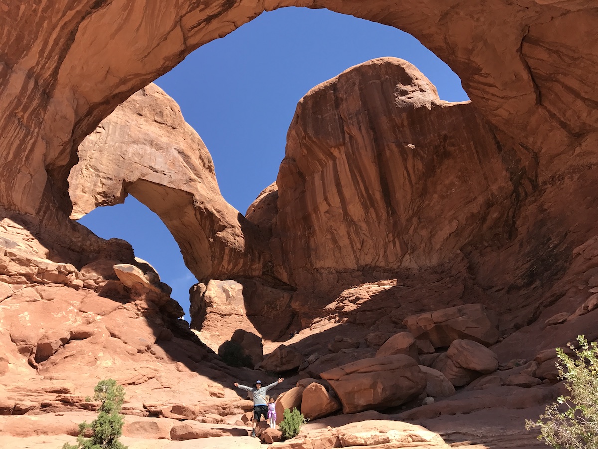 Just when we thought it might be difficult to match the awe-inspiring beauty of Delicate Arch, we discovered that Double Arch comes pretty close! Double Arch has the tallest (112 ft/34 m) and second-longest (144 ft/44 m) arch in the park, and it takes a personal visit to truly experience the vertigo-inducing heights of the arches high above. Bethany enjoyed a short climb to the bottom of the smaller arch, and we were treated to a view of the landscape before us.