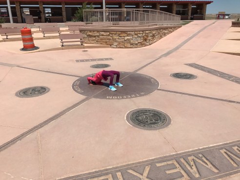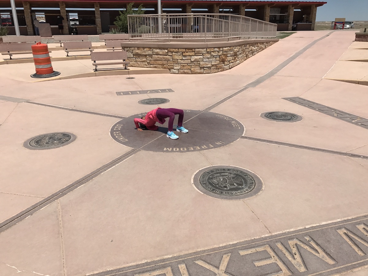 Our next destination was Alamogordo, New Mexico (10 hours/615 miles away), for an overnight stay before heading to White Sands National Monument. Our first stop on this leg of our trip was Four Corners Monument, located on the intersection of the states of Utah, Colorado, New Mexico, and Arizona, and the only place in the USA where four states meet at one point. Along the way, I tried to provide Bethany a brief background of the composition of the United States and the size of California, to give her a reference as to why it would be an interesting experience to be standing in four states at once; I think the lecture worked, given her hilarious poses on the state borders. We also had a great time people-watching, as many visitors gave their best attempts at memorable photos while straddling four state lines.
