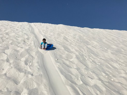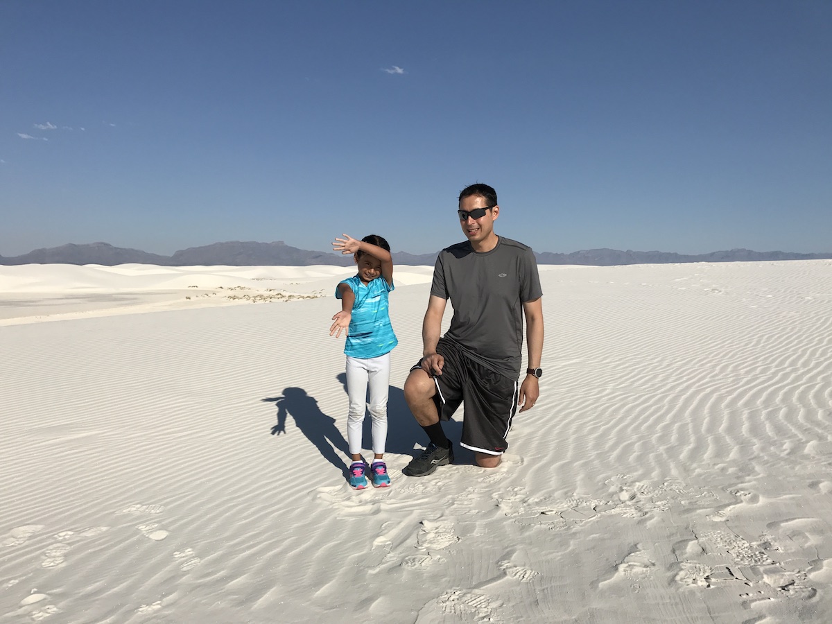 A long time ago, I remember poking through a book at my elementary school’s library and coming across a picture of white sand dunes at White Sands National Park, and thinking how much I would love to visit the place someday; after a few decades I finally had the chance! Of course, seeing this place in person is just so much better! We were lucky to have a blue sky framing the landscape, which Bethany thought resembled snow. While the dunes were definitely not snow in this New Mexico desert, we still attempted a little sledding! We found a good spot to give this a shot, and after several attempts we were able to cruise down the hill on our sleds at a decent speed! After trudging up/sliding down the dune for a few hours in the heat Bethany seemed oblivious to, I decided that we both needed a break in the air-conditioned Visitor Center—to which Bethany reluctantly agreed—before heading off to Deming, New Mexico (4 hours/215 miles away). NOTE: Check for Highway 70 closures before planning a trip to White Sands National Monument!